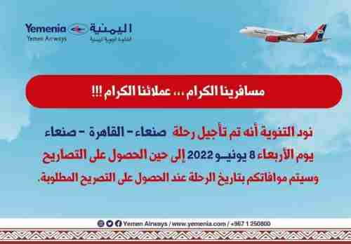 وجاء في تنويه الخطوط الجوية اليمنية، أنه تم تأجيل رحلة صنعاء – القاهرة – صنعاء – يوم الاربعاء الموافق 8 يونيو، إلى أجل غير مسمى.