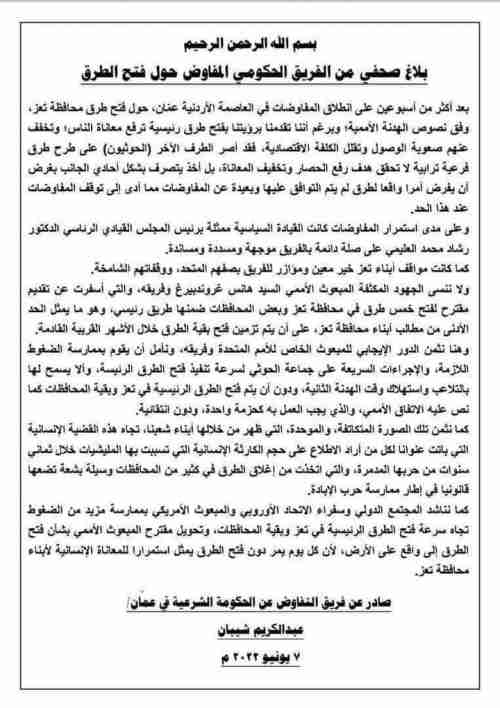 وقال الفريق في بيان رسمي له ان الفريق توصل الى اتفاق يقضي بفتح خمس طرقات الى محافظة تعز بينها طريق رئيسي.