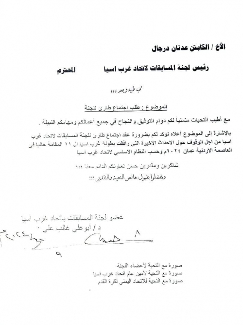 تقدم الدكتور أبو علي غالب عضو لجنة المسابقات باتحاد غرب آسيا ، بطلب عقد اجتماع طارئ للجنة المسابقات بالاتحاد.