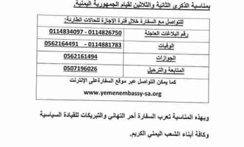 واضافت السفارة في إعلانها: “تعلن سفارة الجمهورية اليمنية بالرياض لأبنائها المقيمين في المملكة العربية السعودية أن يوم الأحد القادم 22/5/2022 الموافق 21/10/1443 إجازة رسمية بمناسبة العيد الثاني والثلاثين لقيام الوحدة اليمنية المباركة”.