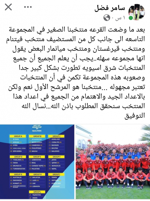 بعد ما وضعت القرعه منتخبنا الصغير في المجموعة التاسعه الى جانب كل من المستضيف منتخب فيتنام ومنتخب قيرغستان ومنتخب ميانمار البعض يقول انها مجموعه سهله..يجب أن يعلم الجميع أن جميع المنتخبات شرق اسيويه تطورت بشكل كبير جدا وصعوبه هذه المجموعة تكمن في أن المنتخبات تعتبر مجهوله …منتخبنا هو المرشح الأول نعم ولكن بالاعداد الجيد والاهتمام من الجميع في اعداد هذا المنتخب سنحقق المطلوب باذن الله…نسال الله التوفيق