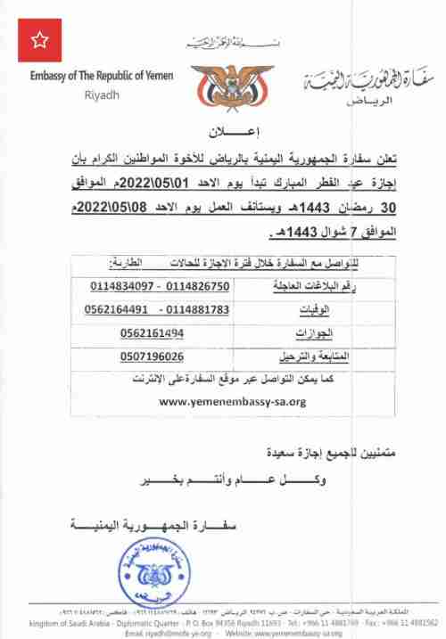 أعلنت السفارة اليمنيه ، للمقيمين في المملكة أن إجازة عيد الفطر المبارك تبدأ من يوم الاحد 30 رمضان 1443 الموافق 1/5/2022 ويستأنف العمل في يوم الأحد 7 شوال الموافق 8/5/2022 متمنين للجميع صوماً مقبولاً وعيداً مباركاً وإجازة سعيدة.