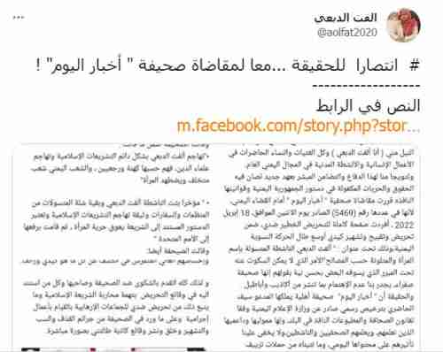 الدبعي وفي منشور لها على صحفته الرسمية في “الفيس بوك” اشارت الى أن الصحيفة وفي عددها رقم (5469) الصادر يوم الاثنين الموافق/ 18 إبريل 2022 ، أفردت صفحة كاملة للتحريض الخطير ضدها.