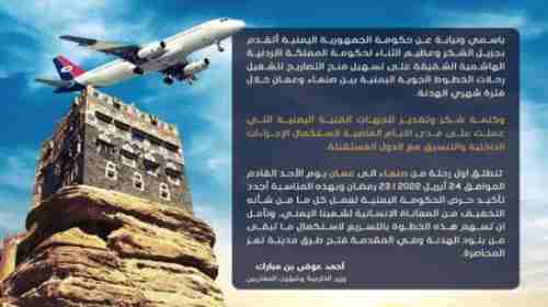 رحبت وزارة الخارجية بقرار الحكومة الاردنية تسهيل منح التصاريح لتشغيل رحلات الخطوط الجوية اليمنية بين صنعاء وعمان خلال فترة شهري الهدنة.