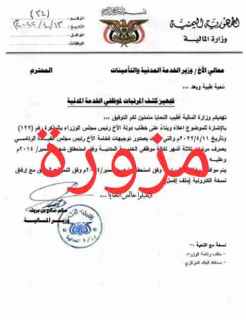 نفى مصدر مسؤول بديوان وزارة المالية في العاصمة المؤقتة عدن، صحة وثيقة مزورة بشأن صرف مرتبات 3 أشهر لكافة موظفي الدولة.