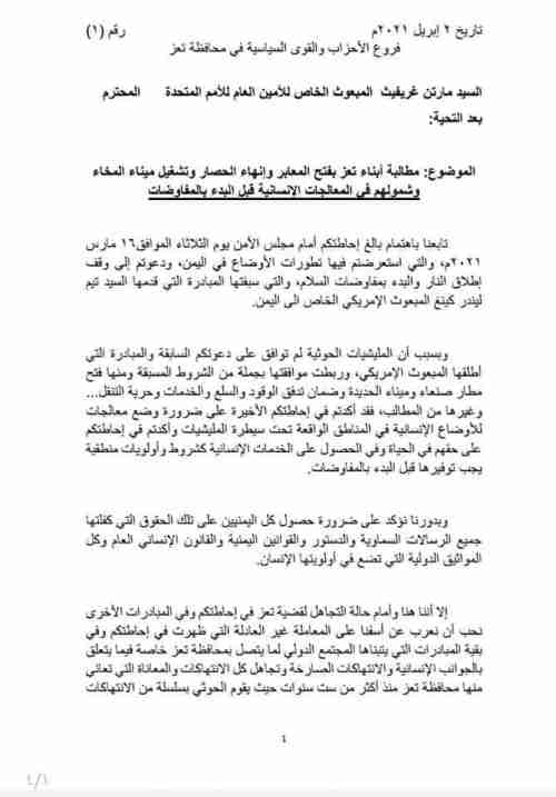 وأعلنت أحزاب تعز رفضها الالتفاف على فتح الطرق الرئيسة بفتح طرق فرعية لا تؤدي لرفع المعاناة عن الناس، مطالبة المبعوث الأممي بإدانة الخروقات التي ترتكبها مليشيات الحوثي.