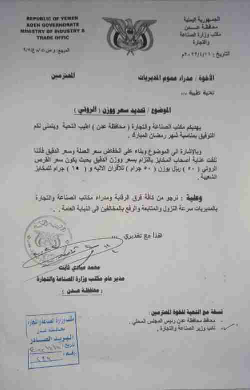 وجه مدير مكتب وزارة الصناعة والتجارة بالعاصمة المؤقتة عدن المهندس محمد عبادي مذكرة الى مدراء عموم المديريات  حدد فيها وزن وسعر القرص الروتي.