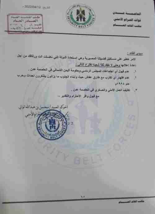 ونشر ناشطون على مواقع التواصل الاجتماعي وثائق موجهة من قائد قوات الحزام الأمني العميد محسن الوالي، إلى الرئيس عيدروس الزبيدي رئيس المجلس الانتقالي الجنوبي نائب رئيس مجلس القيادة الرئاسي، يؤكد فيها الوالي رفض استقبال مجلس القيادة وأطراف الحكومة في عدن.