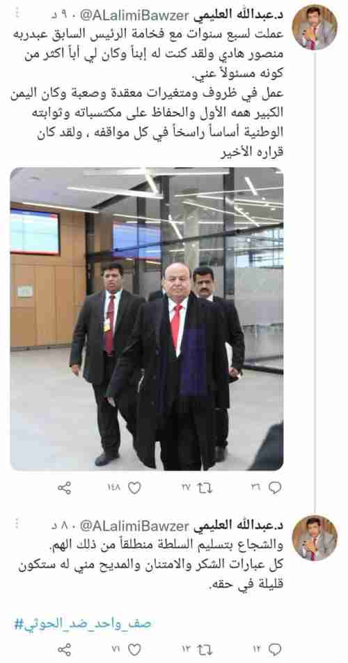 كتب الدكتور عبدالله العليمي مدير مكتب الرئيس عبدربه منصور هادي تغريدة بحسابه في تويتر رصدها محرر الاتحاد نت جاءت على النحو الآتي