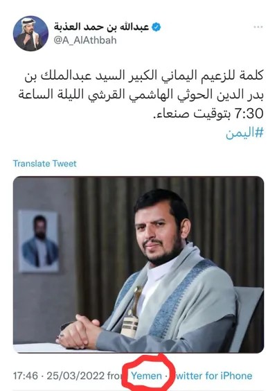 وأظهر موقع تويتر، مكان الإعلامي القطري عبدالله العذبة، من اليمن، خلال تغريدة أشاد فيها بزعيم المتمردين، عبدالملك الحوثي ووصفه بالزعيم اليماني.