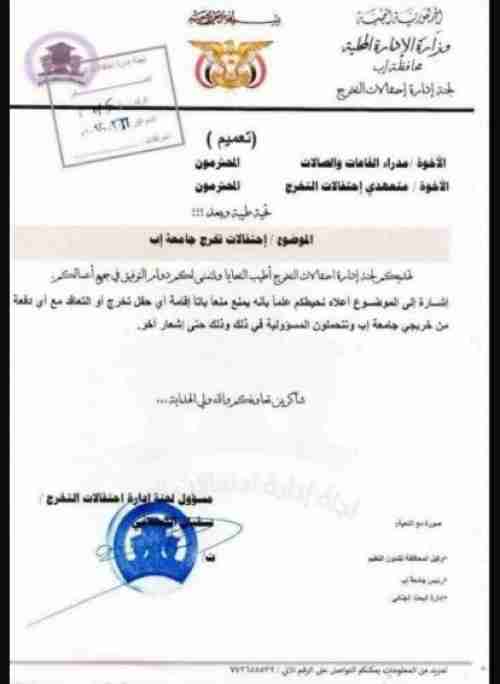 وأظهرت وثيقة خاصة أصدرتها لجنة مستحدثة تحمل مسمى (لجنة إدارة احتفالات التخرج) تابعة للسلطة المحلية التابعة للحوثيين، وموجهة إلى مدراء القاعات وصالات الاحتفالات تؤكد فيه منع إقامة أي حفل تخرج وتحملهم مسؤولية ما يترتب على مخالفة ذلك.
