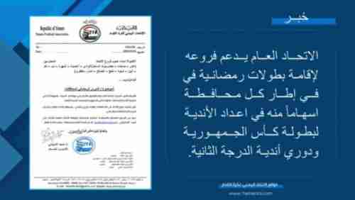 وقال الاتحاد في نشر على صفحته بالفيسبوك، إنه أقر إقامة بطولات رمضانية في إطار كل محافظة اسهاماً منه في تنشيط وإعداد الأندية للمشاركة في بطولة كأس الجمهورية ودوري أندية الدرجة الثانية.
