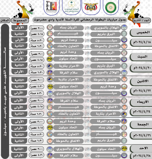 تستئنف الخميس القادم 18 إبرايل البطولة الرمضانية لكرة السلة لأندية حضرموت التي ينظمها فرعا الاتحاد اليمني لكرة السلة بحضرموت الساحل والوادي ويرعاها محافظ محافظة حضرموت الاستاذ مبخوت بن ماضي ويمولها البرنامج السعودي لتنمية وإعمار اليمن التي يشارك فيها 17 نادي من ساحل ووادي حضرموت ..