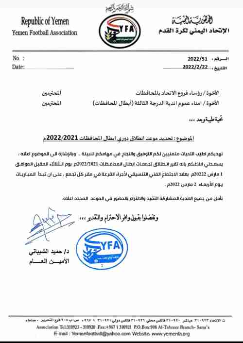 أعلنت الامانه العامة لاتحاد كرة القدم موعد انطلاق دوري أبطال المحافظات للموسم ٢٠٢٢/٢٠٢١