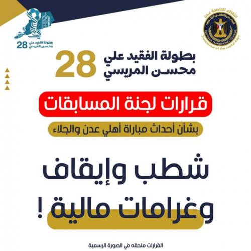 بعد الإطلاع على تقرير مراقب وحكم المباراة رقم (19) لبطولة الفقيد علي محسن المريسي 28 ,