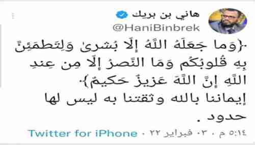 وقال هاني بن بريك في نص تغريدته :”‏﴿وَما جَعَلَهُ اللَّهُ إِلّا بُشرىٰ وَلِتَطمَئِنَّ بِهِ قُلوبُكُم وَمَا النَّصرُ إِلّا مِن عِندِ اللَّهِ إِنَّ اللَّهَ عَزيزٌ حَكيمٌ﴾إيماننا بالله وثقتنا به ليس لها حدود.
