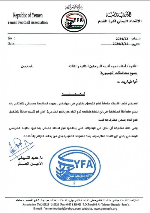 وأكد الاتحاد في تعميم برقم (52) لسنة 2024م أنه في حال مشاركة أي نادي في بطولات ينظمها فرع الاتحاد المنحل بما فيها بطولة المريسي الرمضاني بعدن فإنه سيتم إتخاذ العقوبات بحق من يخالف اللوائح والأنظمة.