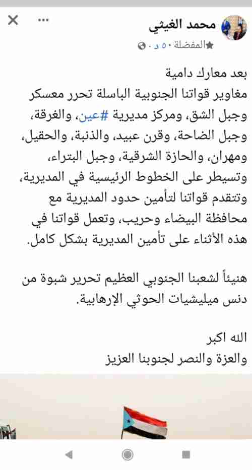 مغاوير قواتنا الجنوبية الباسلة تحرر معسكر وجبل الشق، ومركز مديرية #عين، والغرقة، وجبل الضاحة، وقرن عبيد، والذنبة، والحقيل، ومهران، والحازة الشرقية، وجبل البتراء، وتسيطر على الخطوط الرئيسية في المديرية، وتتقدم قواتنا لتأمين حدود المديرية مع محافظة البيضاء وحريب، وتعمل قواتنا في هذه الأثناء على تأمين المديرية بشكل كامل.