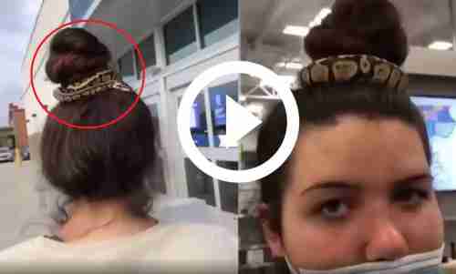 في الفيديو، يمكن رؤية امرأة تدخل مركزًا تجاريًا بشكل عرضي وبها ثعبان صغير على رأسها. رفعت شعرها في كعكة ولفت الأفعى حوله مثل ربطة عنق.