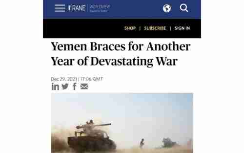 شدد مركز «ستراتفور» للدراسات الاستراتيجية والأمنية في الولايات المتحدة، في تقرير نشره على موقعه الإلكتروني، على أنه «لا توجد أي نهاية واضحة تلوح في الأفق، للحرب التي دخلت قبل شهور عامها الثامن، وجعلت اليمن فريسة، لما تصفه الأمم المتحدة والوكالات الإغاثية الدولية، بالأزمة الإنسانية الأكثر فداحة في العالم». وحَمَّل التقرير الحوثيين مسؤولية نشوب الصراع المدمر الذي يجتاح اليمن منذ سنوات واستمراره، مؤكداً أن تدخل السعودية في مارس 2015، استهدف دعم الحكومة الشرعية المعترف بها دولياً، التي تعمل منذ سقوط صنعاء، انطلاقاً من عدن.