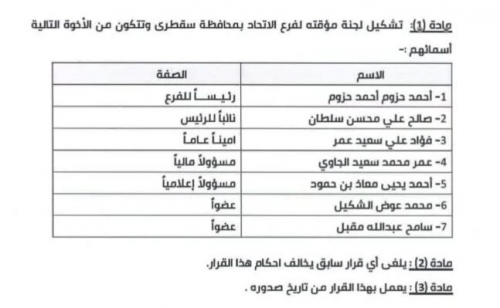 صدر قرار الاتحاد اليمني لكرة القدم رقم (6) للعام 2024م والذي نص على تشكيل فرع الاتحاد بمحافظة سقطرى من الأخوة التالية أسمائهم: