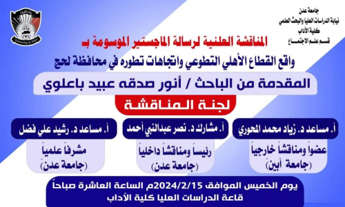 تم صباح امس في قاعة الدراسات بكلية الآداب جامعة عدن مناقشة رسالة الباحث انور صدقة عبيد باعلوي اليوم الخميس عن رسالته الموسومة بـ (واقع القطاع الأهلي التطوعي واتجاهات تطويره في محافظة لحج).