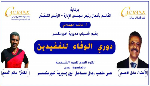 برعاية القائم بأعمال رئيس مجلس الإدارة، الرئيس التنفيذي لكاك بنك، الأستاذ/حاشد محمد الهمداني ، يقيم شباب خور مكسر اليوم الأحد بطولة كأس الوفاء للفقيدين الاستاذ / عادل الأعسم والكابتن/ سالم الأعسم لكرة القدم للفرق الشعبية.