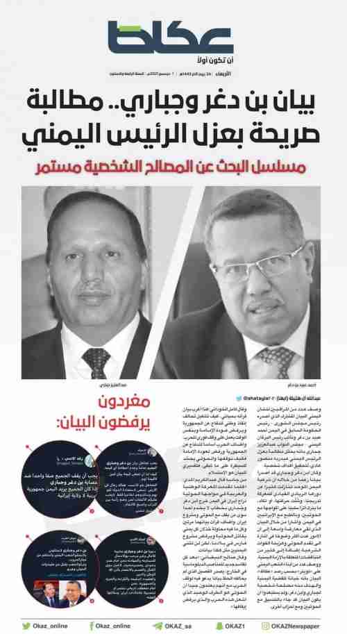 هاجمت صحيفة عكاظ المقربة من النظام السعودي بيان بن دغر وجباري واصفين اياه بأنه يريد عزل الرئيس هادي.