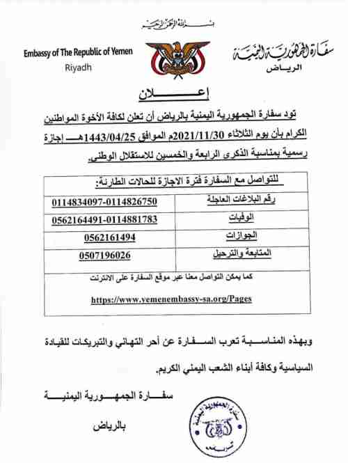 ونشرت السفارة اليمنية بالرياض، عناوين وأرقام التواصل معها في فترة الاجازة وفقاً للبيانات الواردة بالوثيقة المرفقة.
