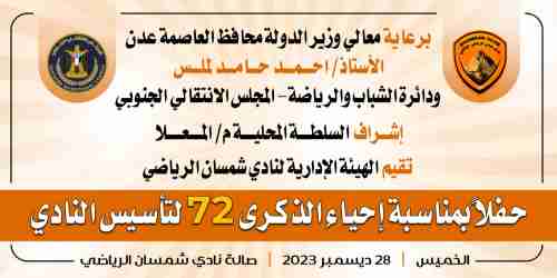 تحتضن قاعة نادي شمسان للمناسبات، بمديرية المعلا، صباح يوم غداً الخميس، الحفل الشمساني التكريمي الذي تقيمه إدارة نادي شمسان الرياضي الثقافي، برئاسة الأستاذ عبدالرحيم جاوي، بمناسبة الذكرى الــ72 لتاسيس النادي، حيث سيشمل الحفل تكريم كوكبة من النجوم والرموز والأبطال في النادي الشمساني الكبير والعريق النادي الذي انجب نجوم لامعه على مدار السنوات والأجيال خدموا النادي الشمساني والرياضة والوطن خلال سنوات طويلة.