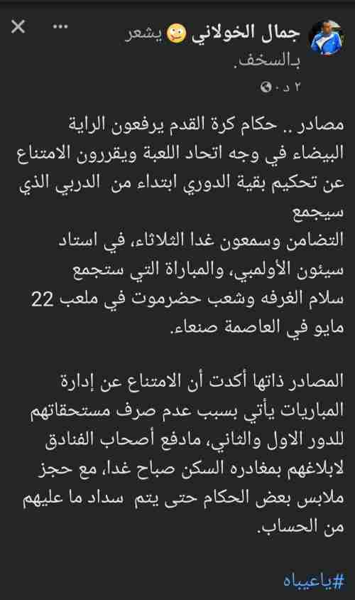 مصادر .. حكام كرة القدم يرفعون الراية البيضاء في وجه اتحاد اللعبة ويقررون الامتناع عن تحكيم بقية الدوري ابتداء من الدربي الذي سيجمع