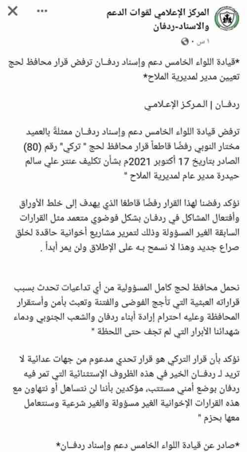 وقال بيان صادر عن اللواء الخامس إن النوبي يرفض تكليف عنتر علي سالم وأشار إلى أن الهدف من ذلك استهداف ردفان.