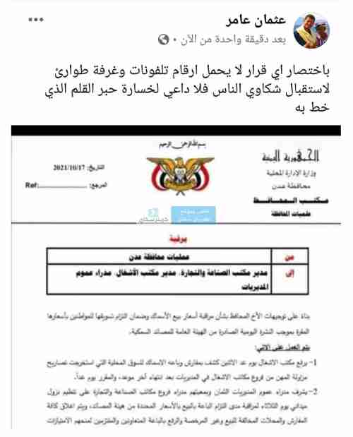 ونوه عامر بإختصار قرارات لايحمل ارقام وتلفونات غرفة الطوارئ لاستقبال الشكاوي فلاداعي لخسارة حبر الورق