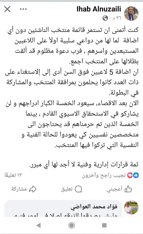 النزيلي أكد عبر صفحته في “فيسبوك” أن القرار انعكس سلبًا على خمسة لاعبين ناشئين تم استبعادهم من القائمة، ما سبب صدمة لهم ولأسرهم، معتبرًا أن “دعوة مظلوم قد ألقت بظلالها على المنتخب بأكمله”.