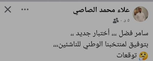 وكتب الصاصي: “سامر فضل… اختبار جديد… بتوفيق لمنتخبنا الوطني للناشئين”، مرفقاً المنشور بإشارة إلى الترقب والتوقعات.