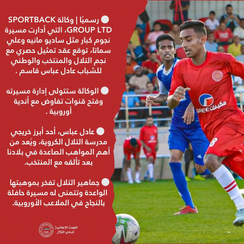 نقلت صفحة نادي التلال الرياضي إعلان وكالة SPORTBACK GROUP LTD العالمية، التي أدارت مسيرة عدد من النجوم البارزين يتقدمهم ساديو مانيه وعلي سماتا، عن توقيعها عقد تمثيل حصري مع نجم التلال والمنتخب الوطني للشباب عادل عباس قاسم.