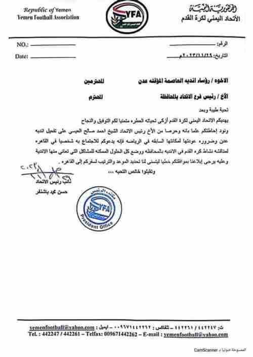 واختتمت المذكرة بمطالبة رؤوساء الأندية على الموافقة الخطية للدعوة المقدمة ، حتى يتسنى تحديد موعد اللقاء ، وترتيب موعد السفر من عدن إلى القاهرة.
