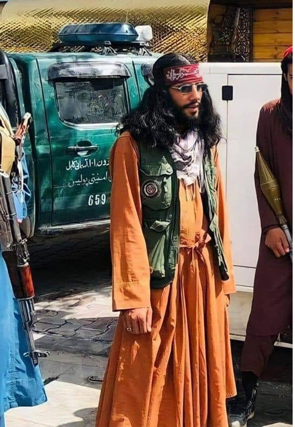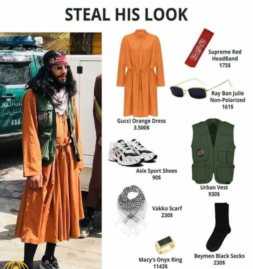 وأظهرت الصورة عضو من طالبان وهو يرتدي فستان قصير باللون البرتقالي من بيت الأزياء العالمي “جوتشي” والذي يبلغ سعر الفستان 3,500 ألف دولار، كما ارتدا حذاء رياضي من asix shoes يبلغ سعره 90 دولار، وفيست سعره 930 دولار، ونضارة من ماركة ريبان سعرها 161 دولار.