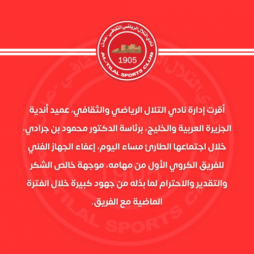 واختتم البيان بالتأكيد على أن التلال سيظل داعمًا لأبنائه اللاعبين ومشجعًا لهم في مسيرتهم الكروية، في إطار من الانضباط والالتزام بالأنظمة والقوانين التي تكفل حقوق جميع الأطراف وتضمن حسن سير العملية الرياضية.