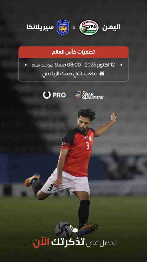 ننوه للجماهير الوفية من الجالية اليمنية المقيمة في المملكة العربية السعودية أنه يمكنهم الحصول على تذاكر مباراة المنتخب الوطني الأول المقررة يوم الخميس الموافق 12 أكتوبر الجاري أمام منتخب سري لانكا في مدينة أبها السعودية ضمن الدور الأول للتصفيات الآسيوية المشتركة المؤهلة لنهائيات كأس آسيا وكأس العالم.