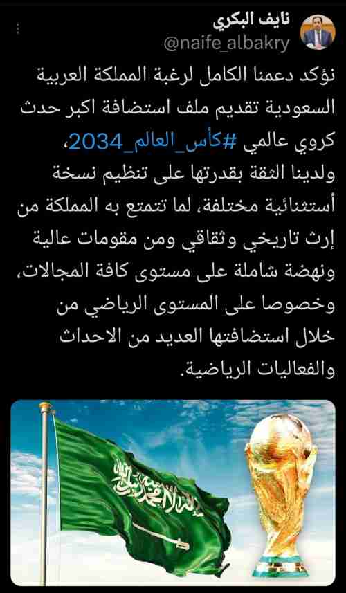 نؤكد دعمنا الكامل لرغبة المملكة العربية السعودية تقديم ملف استضافة اكبر حدث كروي عالمي #كأس_العالم_2034، ولدينا الثقة بقدرتها على تنظيم نسخة أستثنائية مختلفة، لما تتمتع به المملكة من إرث تاريخي وثقاقي ومن مقومات عالية ونهضة شاملة على مستوى كافة المجالات، وخصوصا على المستوى الرياضي من خلال استضافتها العديد من الاحداث والفعاليات الرياضية.