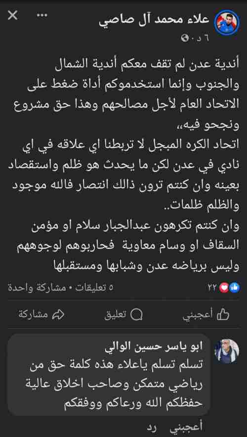 وان كنتم تكرهون عبدالجبار سلام او مؤمن السقاف او وسام معاوية فحاربوهم لوجوههم وليس برياضه عدن وشبابها ومستقبلها.