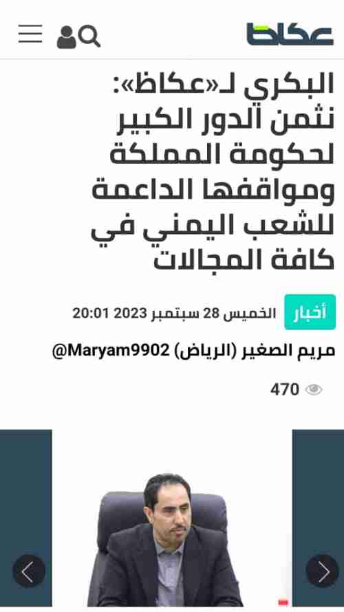 نشرت صحيفة “عكاظ”، السعودية اليوم الجمعة، تصريحا لمعالي وزير الشباب والرياضة نايف صالح البكري، ثمّن فيه الدور الكبير لحكومة المملكة العربية السعودية ومواقفها الداعمة للشعب اليمني في كافة المجالات، ومن بينها، قطاع الرياضة.