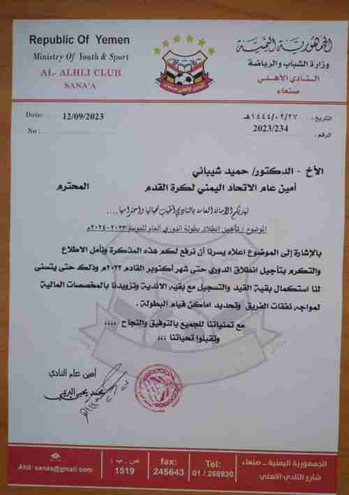 وبرر اهلي صنعاء طلبه في رسالة وجهها امين عام النادي محمد اليريمي إلى د.حميد شيباني امين عام الاتحاد اليمني لكرة القدم بالحصول على فرصة لاستكمال قيد اللاعبين.