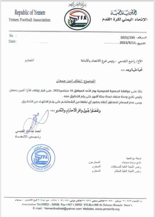 وجه الأخ الشيخ / أحمد صالح العيسي رئيس الاتحاد العام لكرة القدم الاخ / راجح القدمي رئيس فرع الاتحاد في أمانة العاصمة بتنفيذ قرار الجمعية العمومية بإيقاف الاخ / أمين جمعان رئيس وحدة صنعاء .. “ونص التوجيه على عدم السماح له بحضور اي نشاط من انشطة الفرع حتى يتم الانتهاء من التحقيق ” .