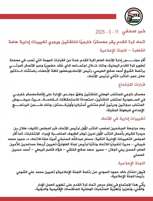 * إقرار معسكر خارجي للناشئين في السعودية وإقامة مباراتين وديتين.