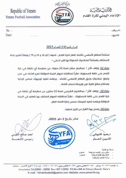 أصدر الاتحاد اليمني لكرة القدم قبل قليل قرار اداري حمل الرقم (14) لسنة 2023/ قضى بعد الديباجة بإيقاف عبد الجبار سلام، رئيس فرع الاتحاد اليمني لكرة القدم بالعاصمة عدن المقال من منصبه مؤخرا، كما نص القرار في فقرته الثانية على إيقاف عبد الكريم الشرجبي لمدة سنتين.