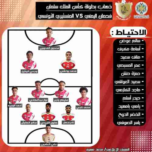 قائمة ممثل الوطن (#فحمان) في لقاءه بدور الذهاب أمام الاتحاد المنستيري التونسي بعد ساعة من الآن ضمن منافسات الدور الأول لبطولة الملك سلمان للأندية العربية ، على استاد الملك فهد الدولي بالرياض.