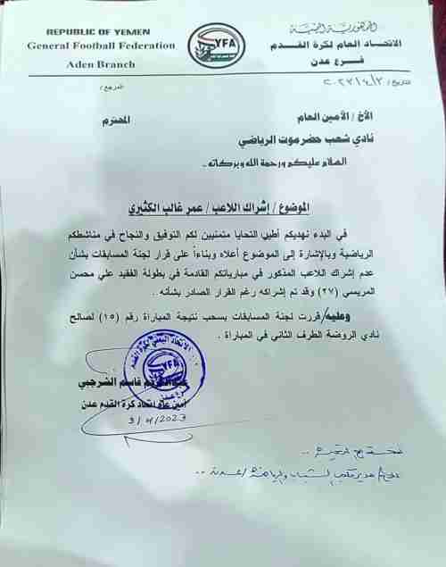 وكان اتحاد كرة القدم بعدن قد أفاد إدارة نادي شعب حضرموت بهذا الموضوع قبل المباراة ، وقرر إيقاف اللاعب، إلا أن الجهاز الفني للفريق تجاهل القرار وتم إشراك اللاعب ضمن صفوفه في مباراة مساء الإثنين.