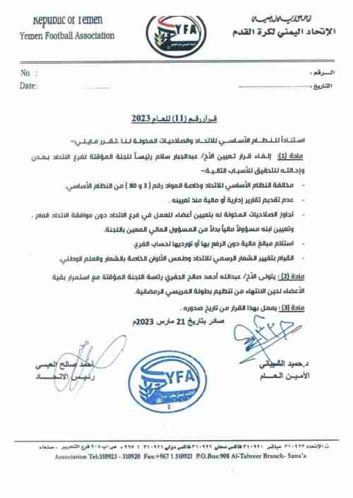 واورد القرار جملة من المخالفات الادارية والمالية للرئيس السابق للجنة المؤقته ابرزها : “ القيام بتغيير الشعار الرسمي للاتحاد وطمس الألوان الخاصة بالشعار والعلم الوطني ، وتجاوز صلاحياته في تعيين ابنه مسئولاً ماليا ، واستلام مبالغ مالية دون الرفع بها او توريدها لحساب الفرع .